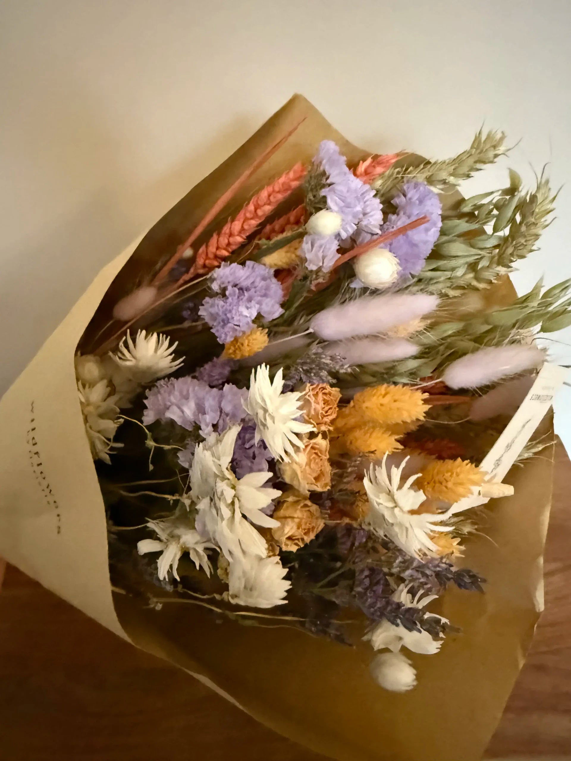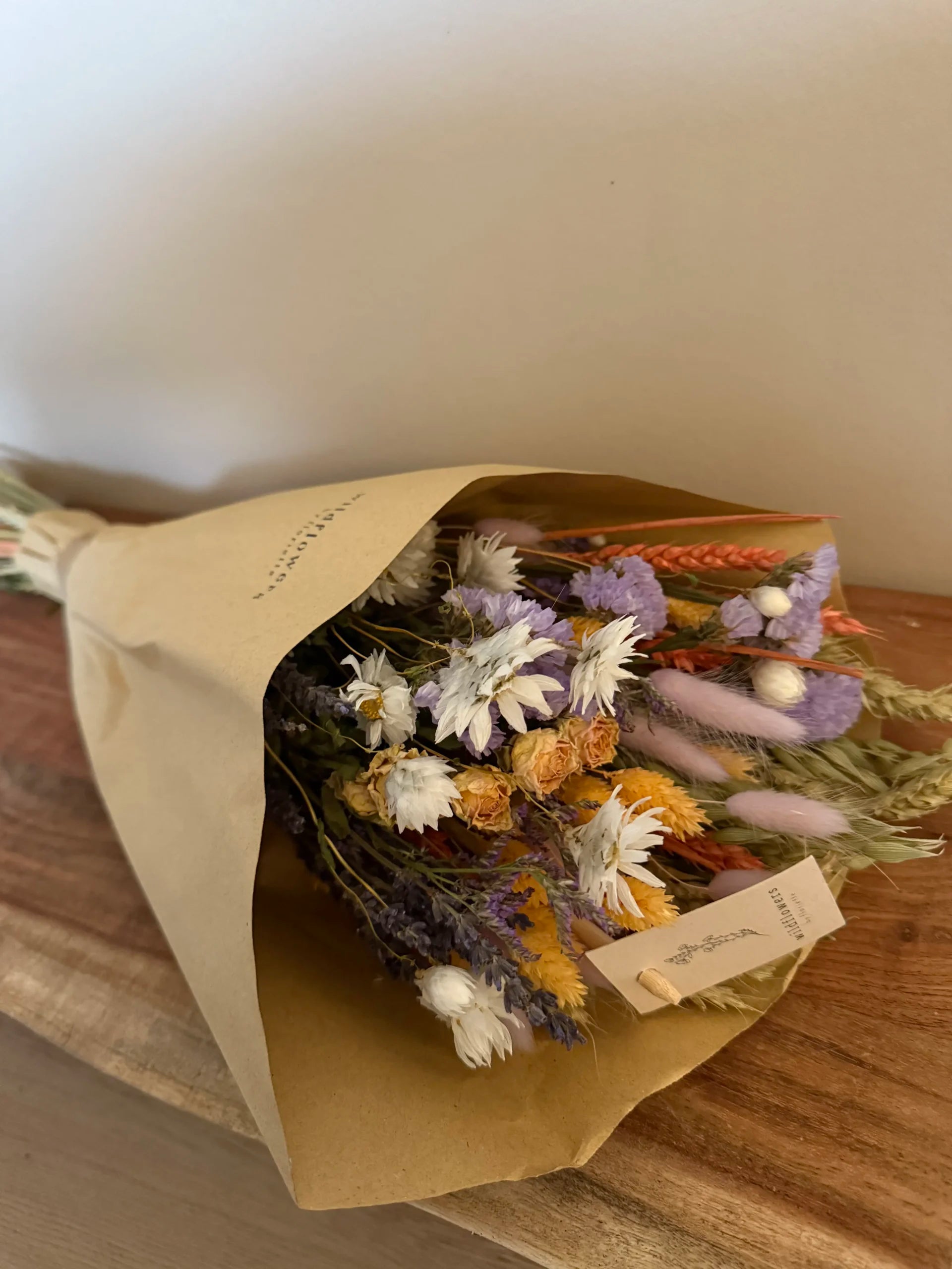 Bring varig skønhed ind i dit hjem med vores håndbundne tørrede buket i smukke pastelfarver. Hver eneste blomst er dyrket med omtanke for naturen – helt uden sprøjtemidler og efter økologiske principper. Takket være en særlig skånsom tørringsteknik bevarer blomsterne deres naturlige farver og struktur, så du får en buket, der holder i månedsvis – helt uden vand og vedligeholdelse.